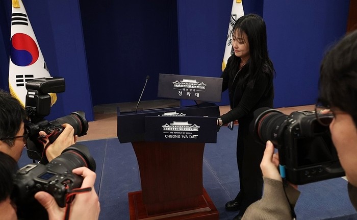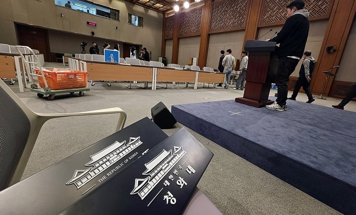 | ▲ 사진=용산 대통령실 이전 작업을 본격화한 21일 청와대 브리핑룸에서 기자와 직원들이 시설 점검 [제공/연합뉴스] |