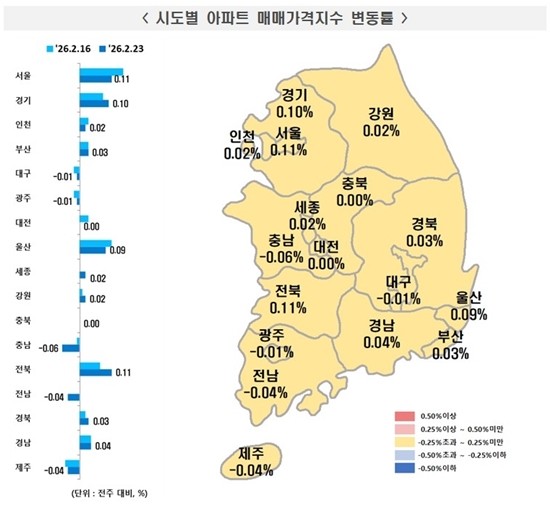 26일 한국부동산원이 발표한 2월 넷째 주(2월23일 기준) 주간 아파트 가격 동향에 따르면 서울 아파트 매매가격은 직전 주 대비 0.11% 상승했다.