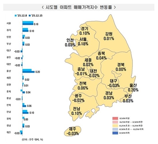 지역별로는 울산(0.15%→0.20%)이 상승폭을 0.05%포인트 확대하며 높은 수준을 기록했고, 부산(0.03%)도 해운대구(0.16%), 동래구(0.15%) 등을 중심으로 가격이 올랐다.