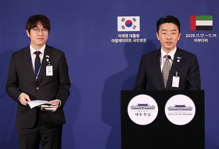 | ▲ 사진=강훈식 대통령비서실장, 18일 아랍에미리트(UAE) 아부다비 한 호텔의 한국프레스센터에서 이재명 대통령 전략경제협력 특사 성과 관련 브리핑, 왼쪽은 하정우 AI미래기획수석 [제공/연합뉴스] |