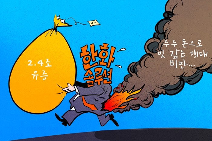| ▲ 데일리-경제만평=한화솔루션, 2조4천억원 유상증자…주주 돈으로 빚갚는 행태 @데일리매거진 |