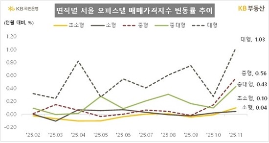 면적별로는 대형이 1.03%로 가장 높은 상승률을 보였고 이어 중형(0.56%), 중대형(0.43%), 초소형(0.10%), 소형(0.04%) 순이었다.