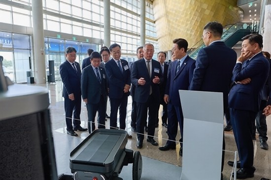 | ▲ 사진=정의선 현대차그룹 회장, 27일 전북 군산새만금컨벤션센터에서 이재명 대통령에게 자율주행휠로봇(MobED)에 대한 설명 [제공/연합뉴스] |