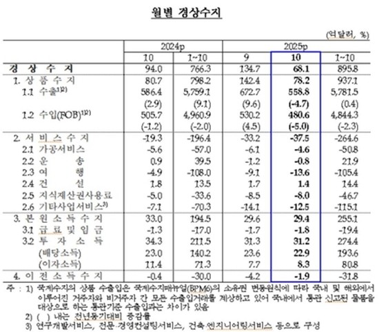 한국은행이 5일 발표한 국제수지 잠정 통계에 따르면 10월 경상수지는 68억1천만달러(약 10조447억원) 흑자로 집계됐다.