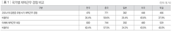 코로나19 팬데믹 기간 중 재택근무를 경험한 비율은 중국이 59.6%로 가장 높았고, 미국(40.6%), 독일(37.9%), 한국(36.4%), 일본(26.4%) 순으로 나타났다.