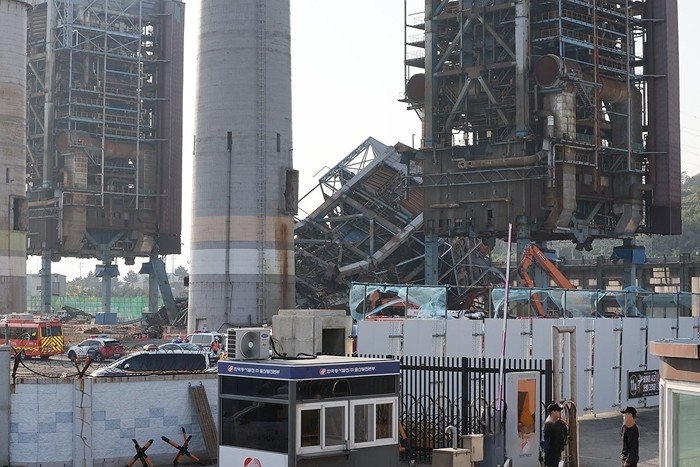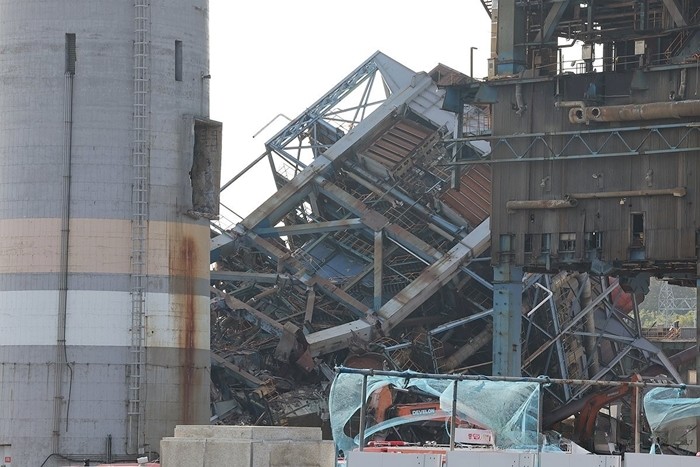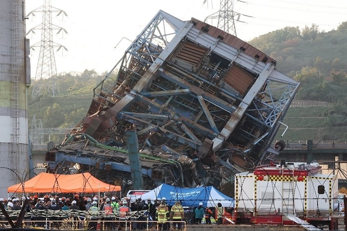 울산 남구 용잠동 한국동서발전 울산발전본부 울산화력발전소에서 6일 높이 60m 보일러 타워가 무너지면서 작업자 7명이 매몰돼 수색 및 구조 작업이 이뤄지고 있다.