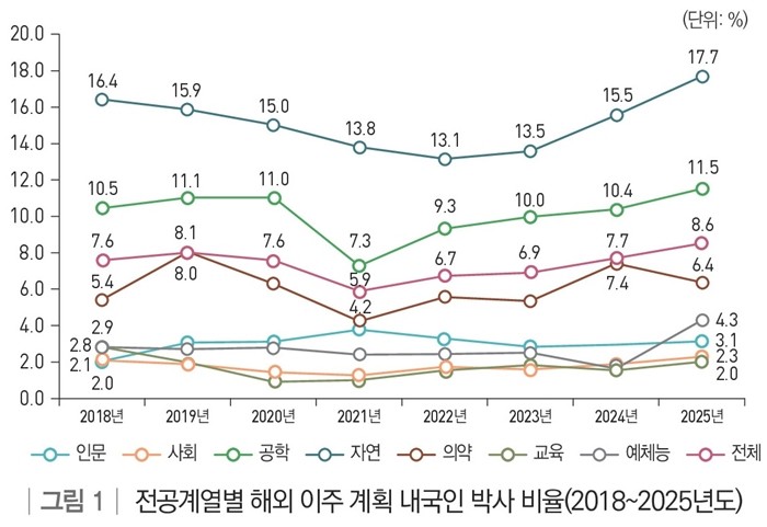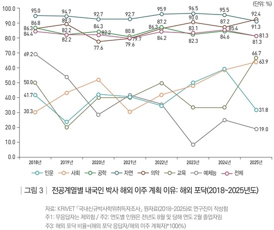 자연 계열 박사는 2018년 16.4%에서 2022년 13.1%로 해외 이주 계획이 줄어들다가 최근까지 늘어나는 경향을 보였고, 공학 계열 박사는 2018년 10.5%에서 2021년 7.3%로 해외 이주 계획이 줄어들다가 자연 계열과 마찬가지로 최근까지 늘어나는 경향을 보였다.