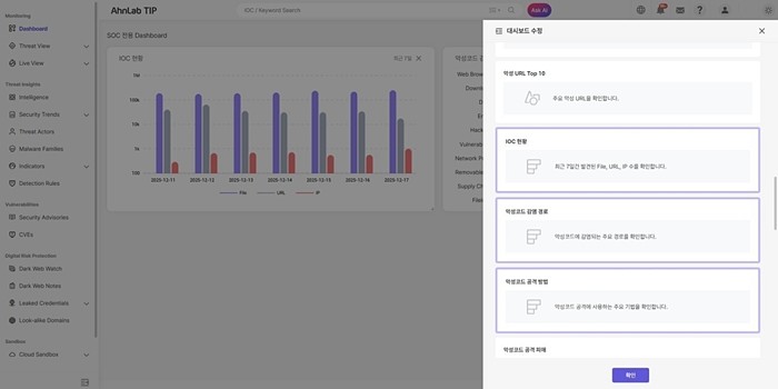 안랩 TIP는 기존 제공 중인 고정형 대시보드를 유지하면서도 고객이 원하는 요소를 자유롭게 선택·배치할 수 있는 ‘사용자 정의 대시보드’ 기능을 신설했다.