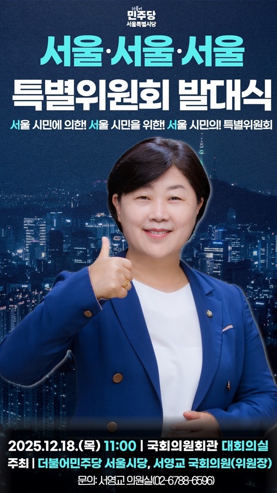 이날 발대식에서는 청년·여성·장애인·소상공인·주거 등 분야별 시민 대표들이 직접 서울시 정책 제안을 건의하고, 이어지는 ‘서영교와 함께하는 서울이야기’ 토크콘서트를 통해 시민의 눈높이에서 서울시정을 점검하며 향후 서울의 비전에 대해 논의할 예정이다.